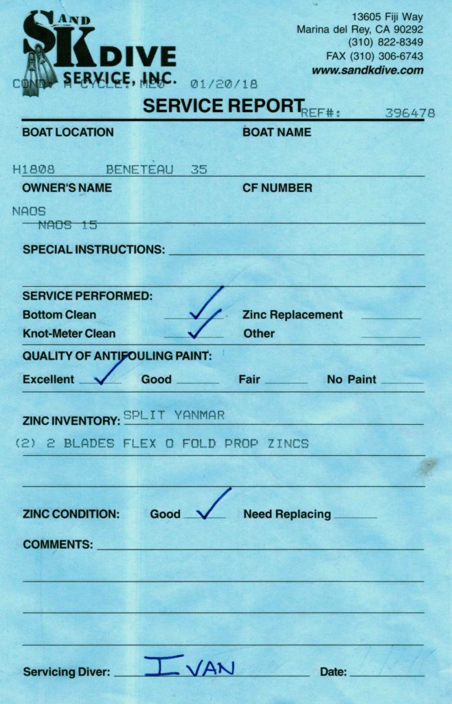 Monthly Reports in writing indicate your paint and zinc condition and any other observations made by the diver. A copy of this report is left on your boat and another copy is mailed with your invoice.